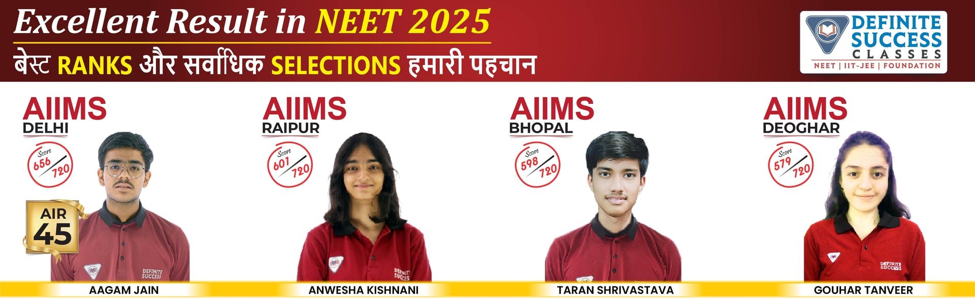 Realize your medical dream with Definite Success Classes in Bhopal. Our focused NEET UG program, led by top faculty, ensures deep conceptual clarity in Physics, Chemistry, and Biology. Join our proven coaching to secure your MBBS seat.